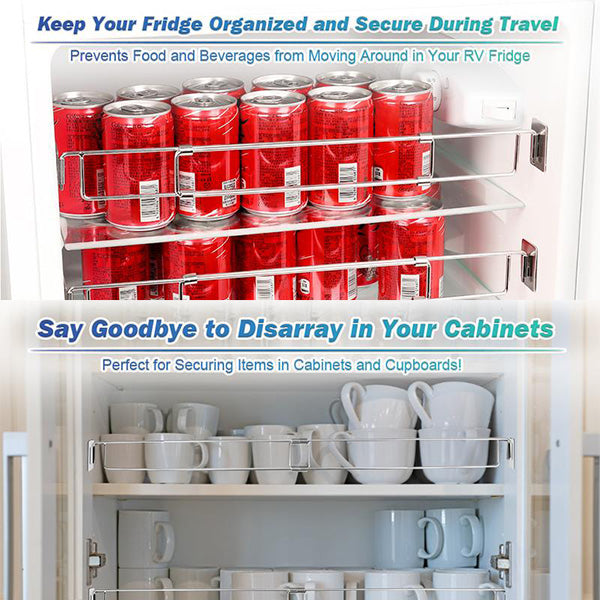 【Designed for RV Travel】Keep your food, drinks, and essentials in place during your journey with our adjustable RV secure bars. Perfect for travel trailers, campers, and RVs, these bars prevent items from shifting and spilling while you're on the road.